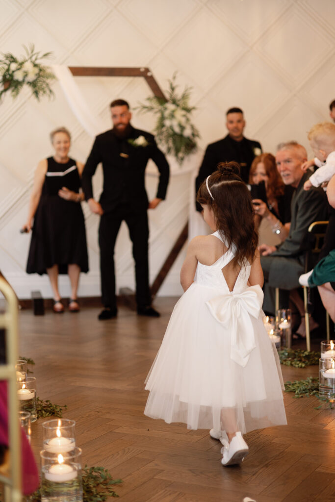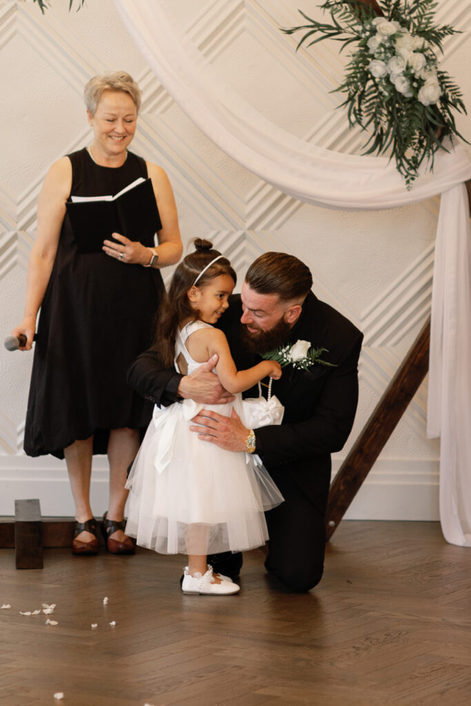 One of the sweetest moments of the afternoon was the bride and groom’s daughter walking down the aisle as the flower girl and meeting her dad for a hug. It was so sweet and you could just see all the love radiating off everyone.